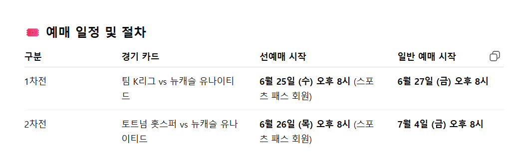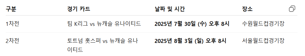 ✅ 1차전: 팀 K리그 vs 뉴캐슬 → 7월 30일 (수)